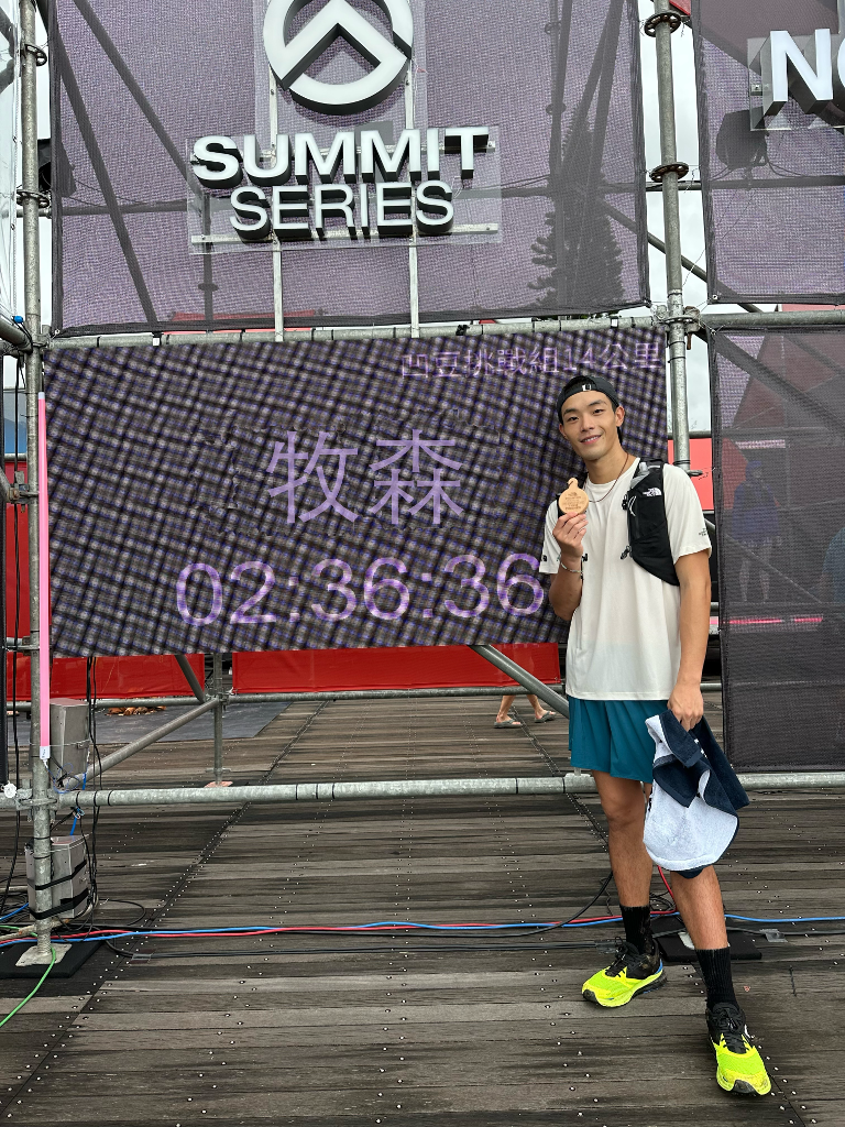 當初得知要參加14公里野跑挑戰,牧森就非常期待,並邀請因拍攝電影《進行曲》培養出好感情的好友劉育仁一起報名。牧森在活動前看了許多影片介紹,了解野跑探險、調節配速的重要。不料活動當天,因連日大雨,泥土地非常濕滑,上坡、下坡,地形多變,平時有在登山的牧森,地形上都還可以適應。