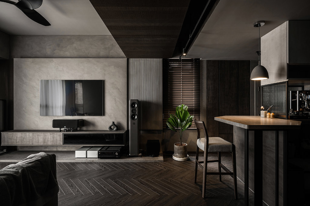 有時候,生活不總是晴天一片、萬里無雲,人總要學會傾聽內心最真實的聲音。而這一間新成屋的屋主,本身偏好深色系,認為深色系能帶來安全感與穩定感,因此墨奕設計的江奕嫻總監以此概念為主,避免使用白色與淺色系,並優先選用帶有雲霧質地的樂土進行格局鋪陳,在光與暗之間做出最佳平衡點,描繪出耐看且不失優雅的暖色調印象。