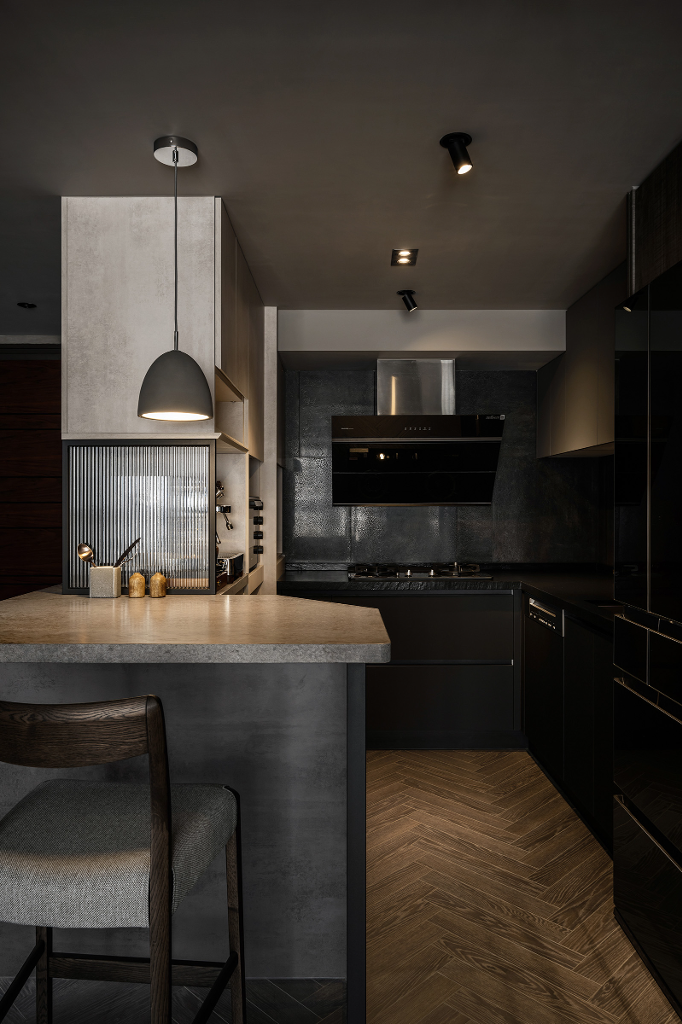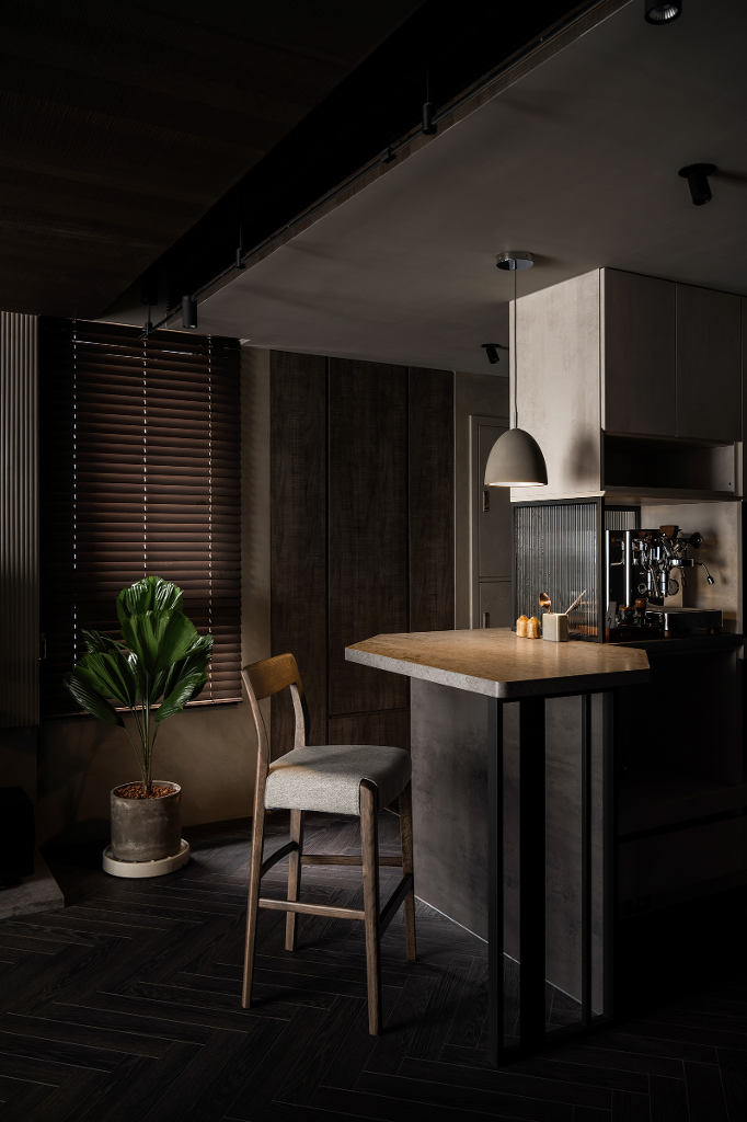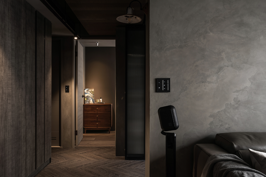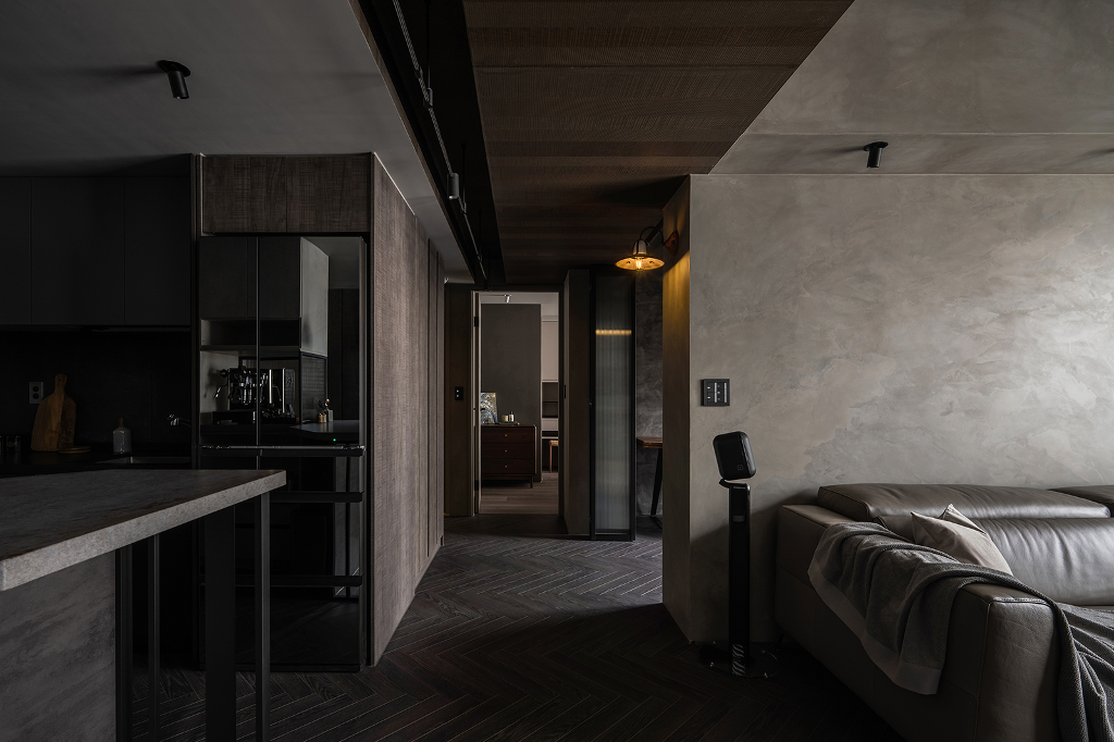 另一方面,設計師使用長虹玻璃與摺疊門,不著痕跡的拉開空間界線,也順勢促成不同功能區域之間產生有趣互動,打造具有穿透性的視野,而諸如地板的人字拼與細微處點綴的馬賽克及石材等特殊材質均為這個深色調住家增添獨特質感與重點色彩,配合揉入大量樂土、特殊塗料、鋼刷木皮等,彼此共同交織出鬆弛有度的平和氣息,讓屋主在回到家的那一瞬間,便能深刻感受到壓力與煩憂的徹底釋放,打從心底產生被牢牢守護著的安心思緒。