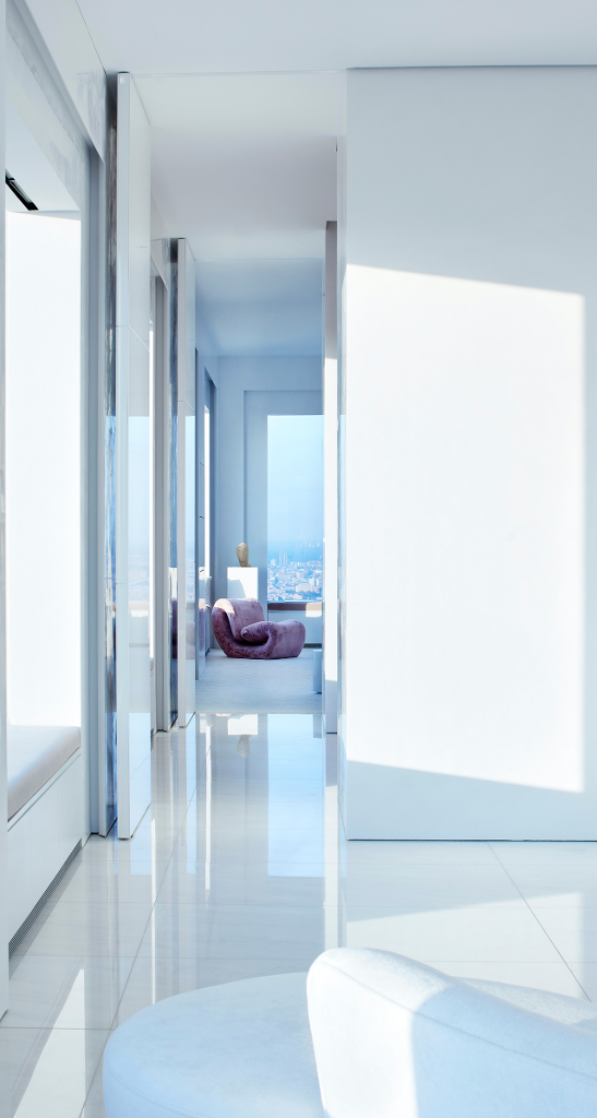 全室以純白色為基調,讓每件經典收藏品得以充分展現它們的姿態。室內設計巧妙融入了Richard Long、Morris Louis和Kenneth Noland等著名藝術家的作品,每件藝術品都被精心擺放於不同的房間,使每個空間都成為視覺焦點。地板則選用了木紋或磁磚,巧妙利用光影變化,區分出各個空間的使用特性與氛圍。為了讓屋主能夠擁有開闊的視野,欣賞到完整的城市景觀,設計師特意選用了白色的威尼斯灰泥牆面,並設置了大型方形窗戶,取代傳統的窗簾或百葉窗。這樣的設計不僅最大限度地引入了自然光,也讓人可以更自由地俯瞰窗外美景。