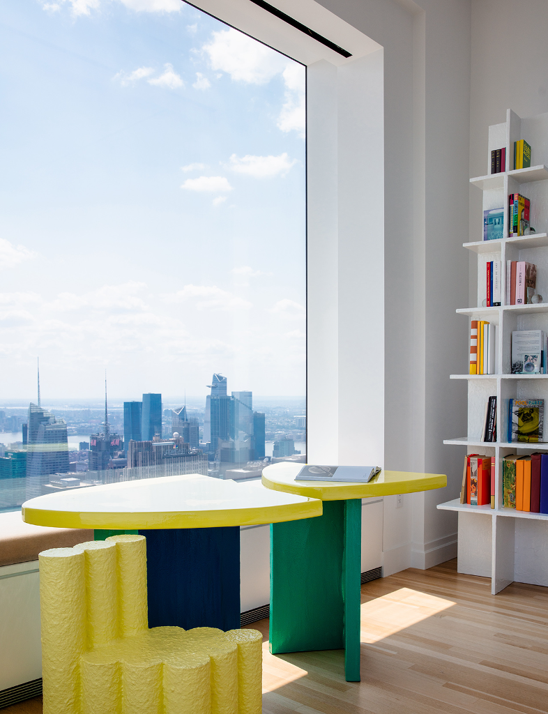 書房區域則更顯藝術氛圍。牆面上懸掛著一幅Kenneth Noland的大型畫作,下面沿著牆面是一張藍色的Vladimir Kagan〈Library〉沙發,搭配Lella & Massimo Vignelli〈Metaphora〉咖啡桌,旁邊還有訂製的蘑菇矮凳。這些設計元素共同營造出一個既舒適又充滿藝術氣息的閱讀環境,讓使用者可以在輕鬆愉悅的氛圍中享受閱讀時光。整體而言,Crina Arghirescu Rogard對色彩與構圖的獨到見解,為居住空間注入了與曼哈頓天際線相映成趣的獨特魅力。