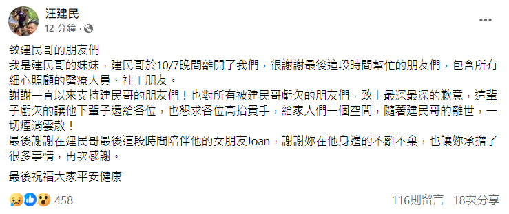 謝謝一直以來支持建民哥的朋友們!也對所有被建民哥虧欠的朋友們,致上最深最深的歉意,這輩子虧欠的讓他下輩子還給各位,也懇求各位高抬貴手,給家人們一個空間,隨著建民哥的離世,一切煙消雲散!