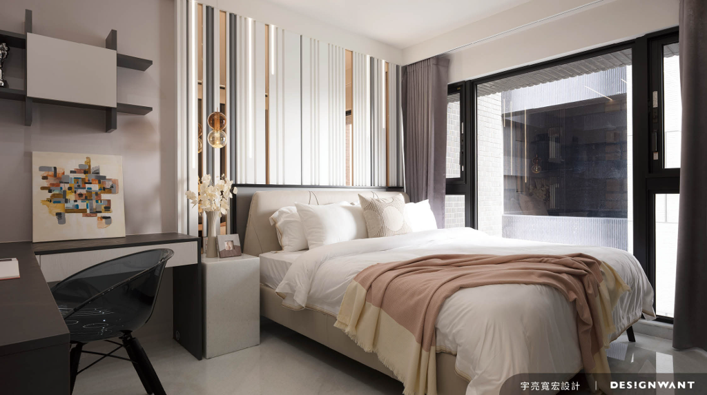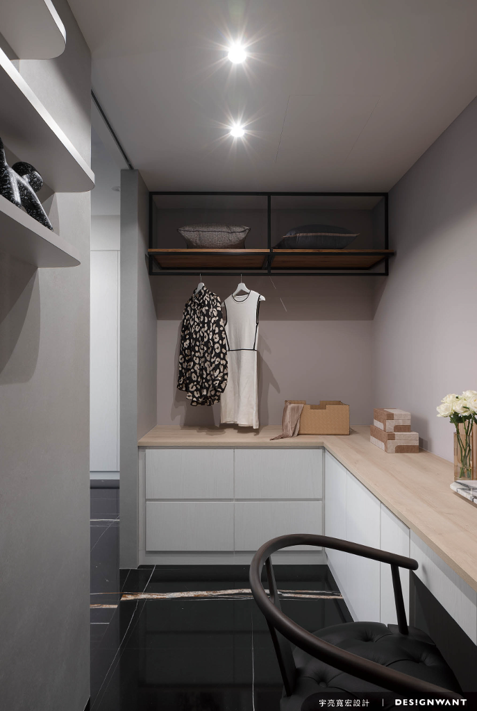 一旁女兒房透過琥珀鏡、灰白烤漆與間接燈帶做出牆面串接,創造音符流瀉般的動態感,既連結了使用者的專業興趣,也為生活帶來活潑、愉悅的感知情境。