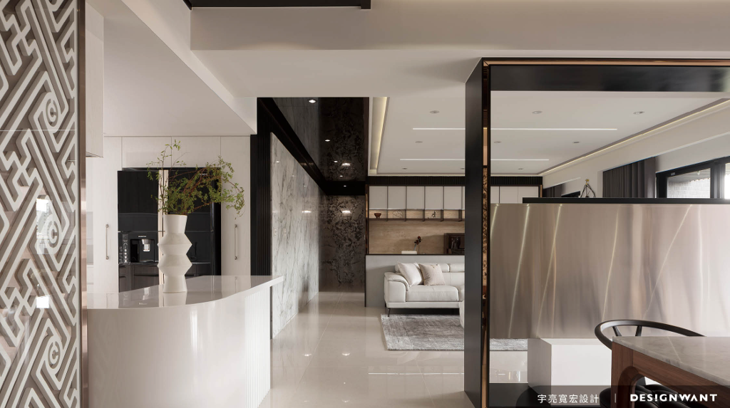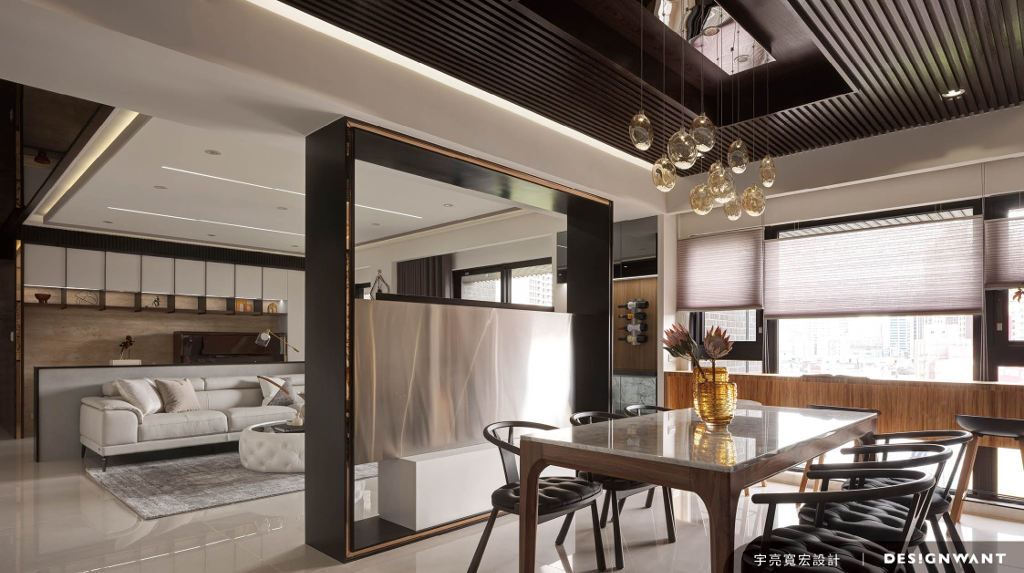 客、餐廳之間以大梁下方的框形電視牆連結,這樣巧妙的安排,使框景軟化結構梁造成的壓迫感,也讓整 體視覺更為開放通透。客廳天花與一旁的走廊則延續框形及鏡面材質的運用,藉此建構一個風格語彙完整的生活空間。吧台旁的屏風,精心以鍍鈦玫瑰金結合C字型紋飾設計,呼應女屋主的名字,使專屬的符碼轉譯銘刻成空間的視覺焦點。