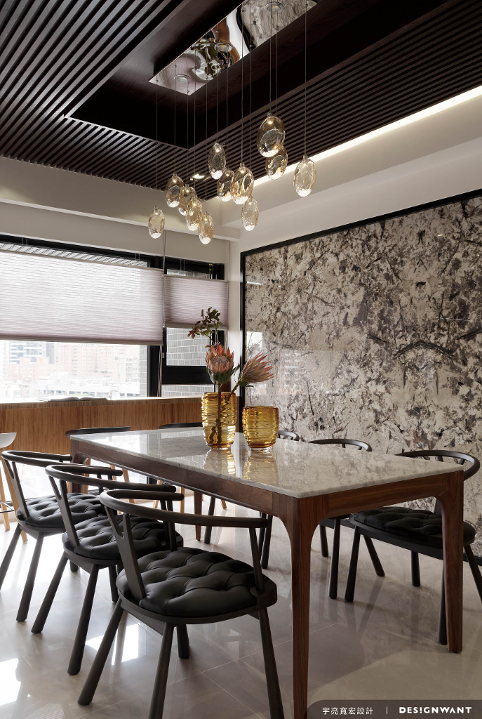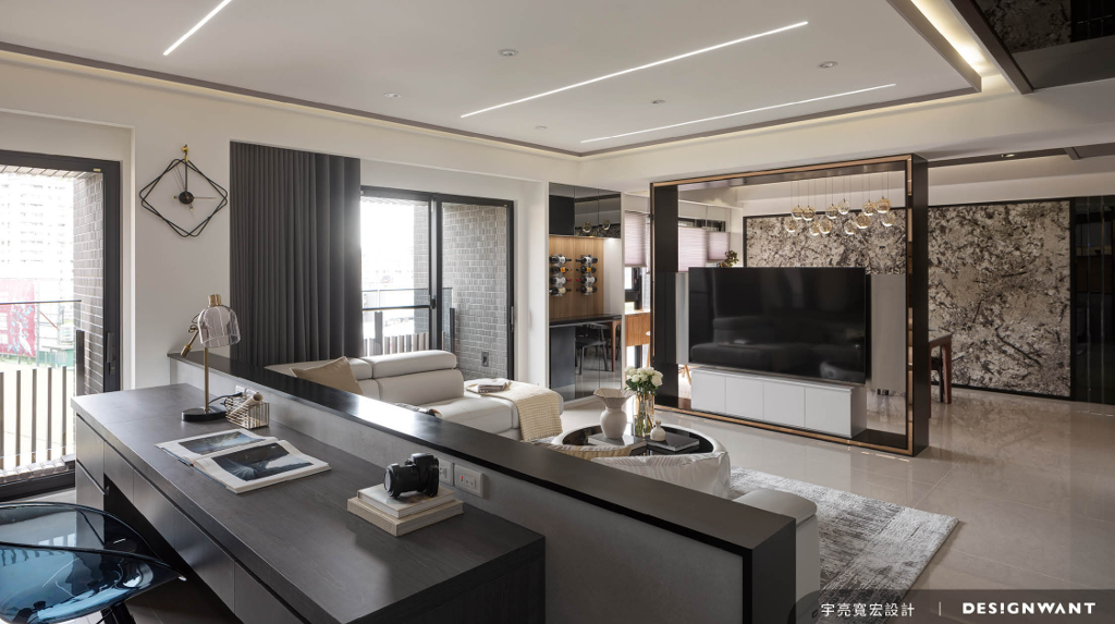 穿過窗櫺的日光照拂在玻璃質地的介面,光線漫射至金屬與灰鏡上,連同拋光大理石紋的反射,形塑出極明亮的生活場域,一個閃耀中烘托著輕奢氛圍的質感之宅。由年輕夫婦與女兒同住的居所呈狹長形布局,規劃以「通透全室」的開放思維,令室外充足光線與景致能和室內連成一氣,讓家呈現出明亮、寬闊的視覺體驗。