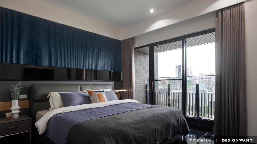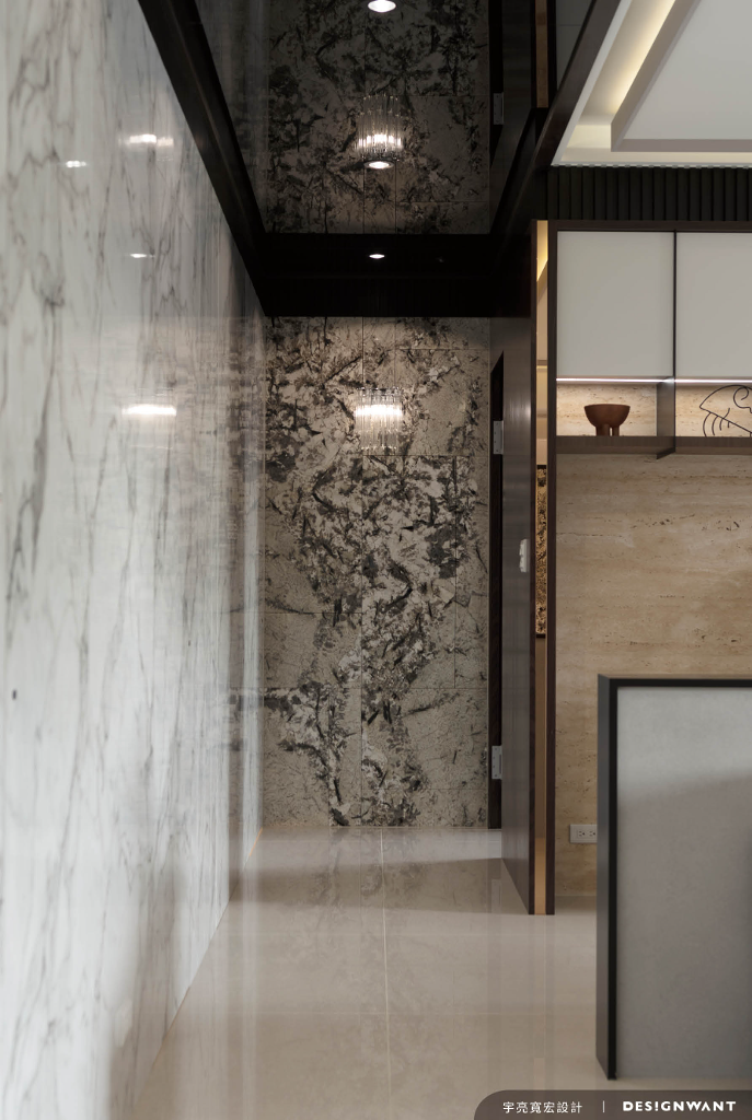 從書房轉折進私領域過道處,三個立面包圍著不同款的大理石面,交相映於過道天花板的黑色鏡面中,更顯優雅的儀式感洗禮。主次臥皆以家庭成員各自喜好特質發展,主臥室以沉穩大氣的深沉色系帶過,主牆的深藍質面與黑色系石材地面讓高貴氛圍不言而喻。