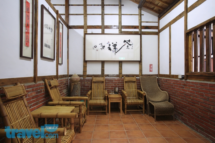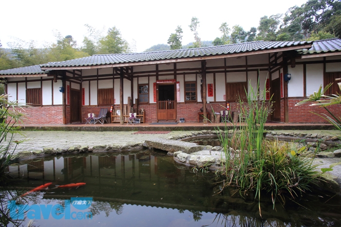 同樣擁有竹山老屋的特色,以竹子取代木頭做為房屋的樑柱,從側面還看得到一根根直橫長短交錯的竹子,竹、木、紅磚構成房子的主結構,牆面是傳統的竹編牆,微翹的屋簷是標準閩南式建築。林文山將房子整理得俐落,屋前還闢了水池、造了庭園、種了花草,屋後的山坡也是林家的地,他在山坡上搭了一間泡茶亭,從高處俯瞰,「有竹居」靜靜坐落在一片山林竹海之間,他指著對面山上的一棟房子說:「距離最近能看到的房子就那間了」。因為是一條龍式的建築,「有竹居」只能隔出四間客房,不過別看它是間老屋,林文山在整修時可是加了地熱、TOTO衛浴等先進的配備,還特別購置檀香浴澡桶,讓客人泡澡時也能沉浸在木香之中。獨立在山中的「有竹居」最適合一家族或三兩家庭同遊,就好像是自己擁有一棟房子。