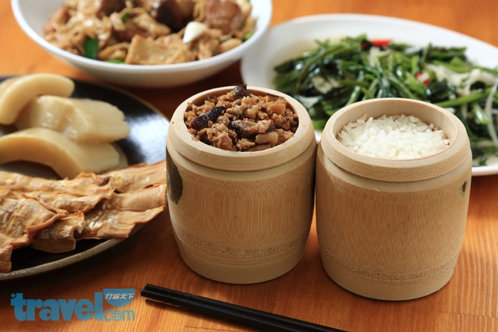 竹山鎮以「竹」聞名,除了茶園之外,就屬滿山的孟宗竹林最為壯觀,於是當地人很早就懂得利用各種醃漬手法做出好吃的竹筍料理,在「小竹屋」就傳承下這古早味。最早,小竹屋從賣竹筒飯起家,老闆告訴我們必須使用未曬乾仍保有水氣的竹子,然後生米直接放進竹筒裡蒸,這樣才能讓竹香進入米飯中,小竹屋更選用台梗9號米,讓竹筒飯吃起來帶有Q勁。
