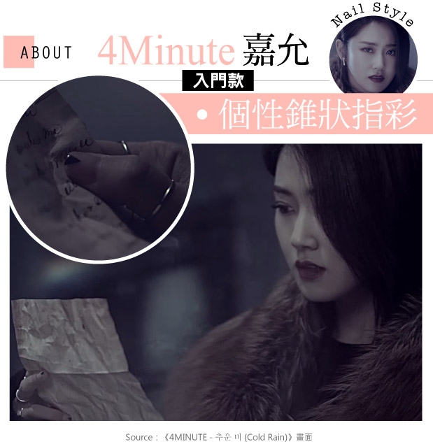 韓國強勢女團4Minute於2015年2月發表的最新專輯Crazy中,抒情主打歌Cold Rain不只旋律動聽,成員們奢華成熟的姐姐風造型更是吸引了粉絲們的目光。其中,主唱嘉允帥氣的「錐狀指彩」更是吸引了SHiNE編輯的目光,這款指彩造型簡約卻充滿了時髦感,是沒有D.I.Y經驗的彩繪新手也能輕鬆上手的最佳選擇!