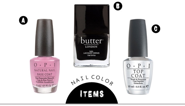 A. Base Coat 自然基礎護甲油#NTT10 15ml NT.480/OPI 、B. 黑色指甲油 #英國黑旗幟 11ml NT.620/butter LONDON 、C. Top Coat 亮麗保色護甲油 #NTT30 15ml NT.480/OPI
