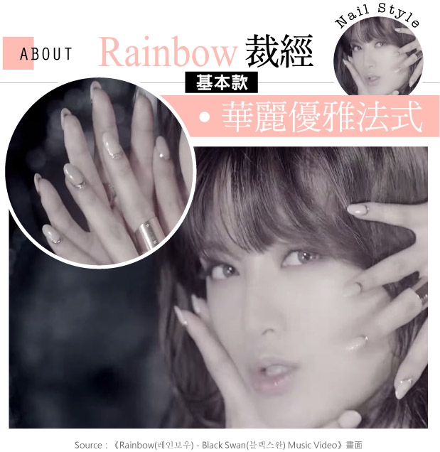 以一曲《黑天鵝》性感回歸的韓國女團Rainbow,隊長裁經不只曾是少女時代的預備隊員,更是主持過美妝流行節目《Get it Beauty》的全方位美女,這次在MV裡將優雅的法式指彩進化改造,運用閃亮的金色光澤與柔美的裸色搭配,完成了既華麗又優雅的指甲彩繪,讓人一眼就被她的魅力給擄獲!