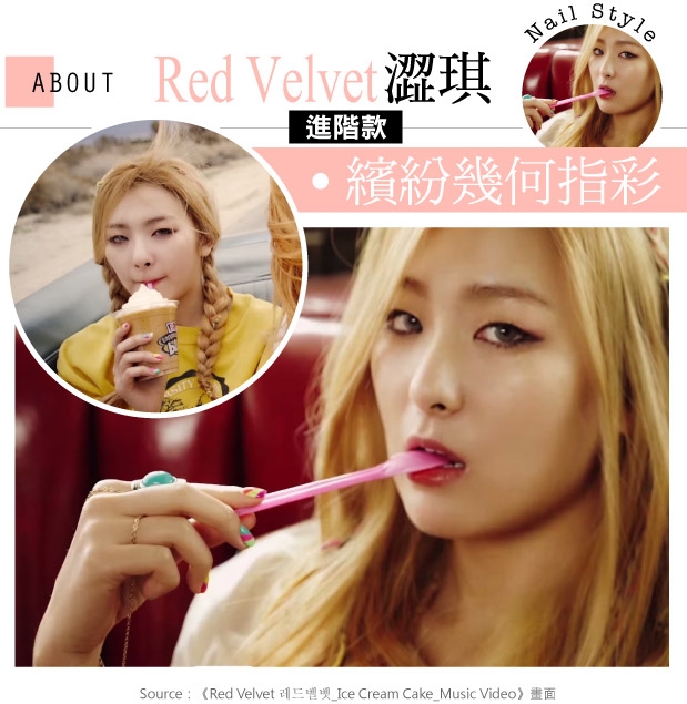 Super Junior、少女時代、EXO等韓流巨星的師妹團-超級新人團體Red Velvet,首張迷你專輯《ICE CREAM CAKE》一推出,令人中毒的旋律、目不暇給的精采造型加上5個少女精湛的舞技,馬上成為話題中心!隊裡的魅力擔當-澀琪(Seul Gi)指尖的繽紛幾何指彩更是可愛的不得了,雖然需要的技巧比前兩款造型更高級一些,不過只要願意多試幾次,自己D.I.Y也絕對可以成功!