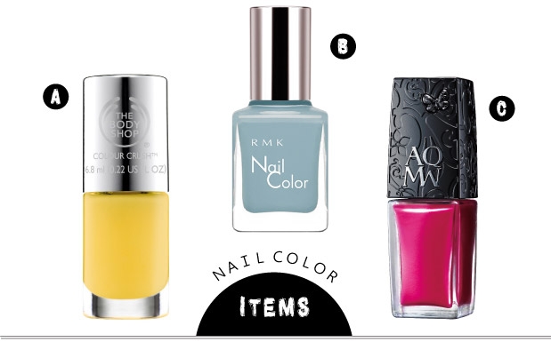A. 馬卡龍指甲油 #黃雛菊 6.8ml NT.300/THE BODY SHOP、B. 黑絕色指甲油 #EX-28 12ml NT.550/RMK、C. 舞蝶指彩 #PK847 NT.800/黛珂 AQMW