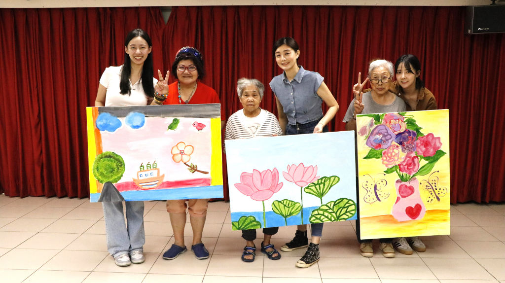 ▲ 張菁菁(左一)、夏如芝、蔡衣宸(右)與長輩一同作畫。(圖:天主教失智老人基金會)