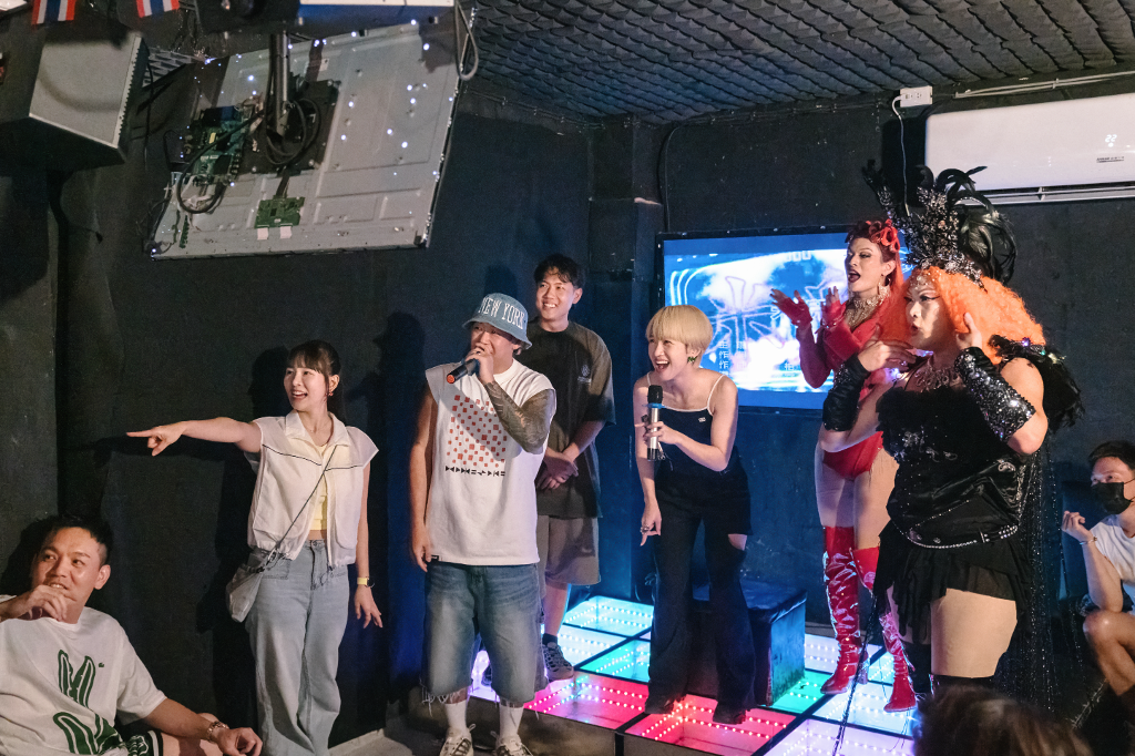 ▲ 主持群深夜進入神秘空間,嗨唱之餘不忘宣傳市集。(圖:東森)