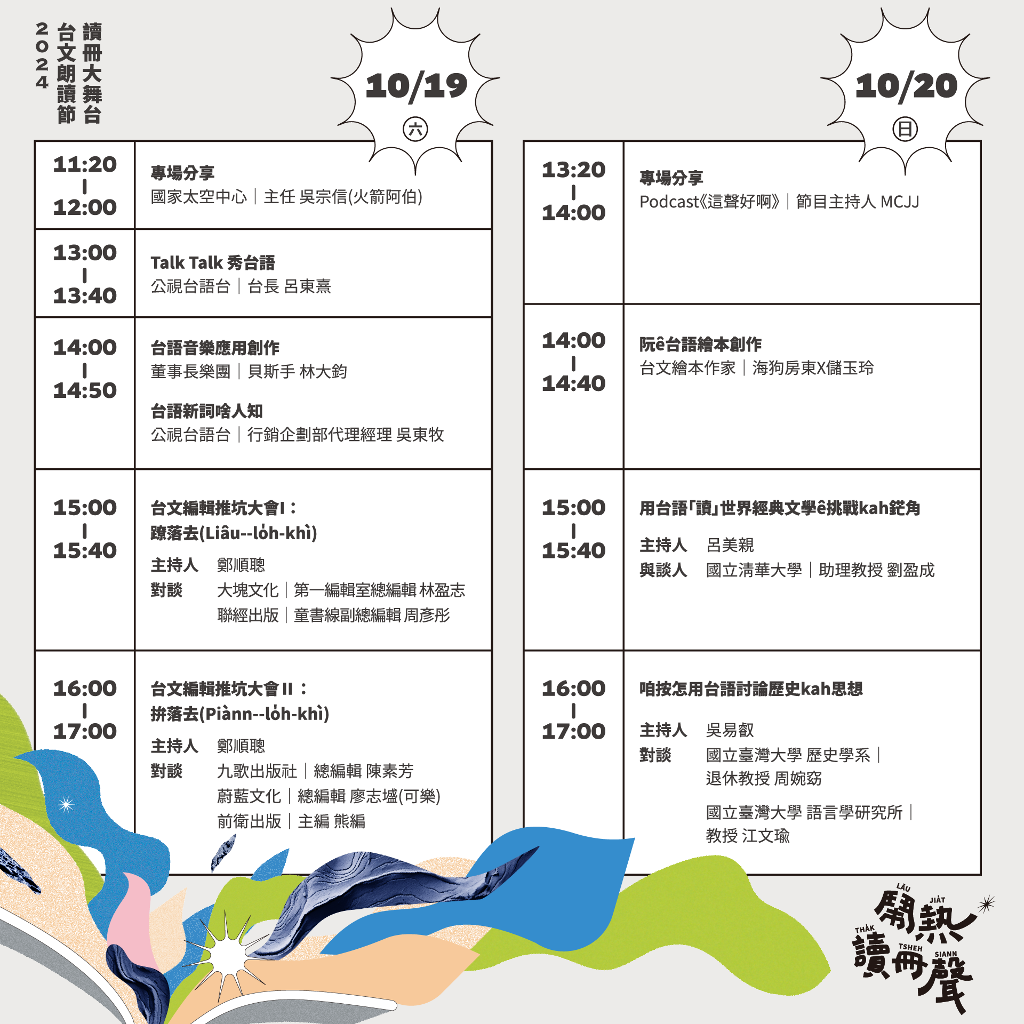 本次活動亮點滿滿,有豐富的兩日論壇,在「讀冊大舞台」精彩的卡司名單包含阮劇團Podcast《這聲好啊》節目主持人 MCJJ現場開講大放送;現任國家太空中心主任「火箭阿伯」吳宗信專場分享;公視台語台「呂東熹」台長帶來《talk talk show台語》的製作分享,董事長樂團的貝斯手林大鈞(鈞董)聊聊台語音樂的創作故事,接著由作家鄭順聰領頭的「台文編輯推坑大會」邀來各出版社台文編輯們一起聊聊「蹽落去(Liâu--lo̍h-khì)」的契機緣由,以及「拚落去(Piànn--lo̍h-khì)」的熱血使命感。