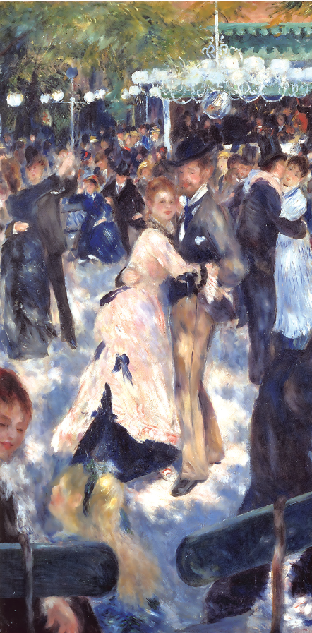 這些朋友不是免費充當模特兒,就是幫忙搬運畫布,積極協助雷諾瓦工作。將人工照明視為「死光」、「罐頭光」的雷諾瓦,終其一生都在極力頌揚戶外陽光的千變萬化之美。比起店內的舞池,他選擇畫作的主題,自然是戶外的舞會場景。此刻展現在我們眼前的,便是充分展現雷諾瓦個人特色的溫暖氛圍、彷彿能穿透畫面即可聽到聲樂喧囂的蓬勃朝氣,感受從疏斜樹影間灑落的燦爛陽光。照映在人物面龐、服裝、地面上的柔和光線,簡直令這幅畫的幸福感爆表。