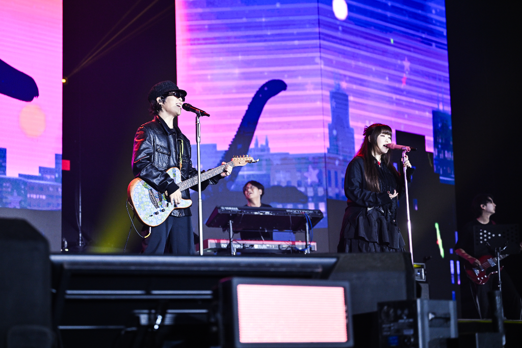 第二組登場的,則是被粉絲盛讚每次聽都意猶未盡,好想再聽無數次的AKMU(樂童音樂家),哥哥李燦赫與妹妹李秀賢兩人音樂創作實力有目共睹,日前才剛辦完十週年演唱會的他們,有超多海外的AKKADEMY敲碗跪求,無不希望兄妹倆能舉辦世巡,因此這次「K-WONDER CONCERT」也聚集不少來自中、南部,甚至從日本、泰國與香港的粉絲,特地安排假期飛來朝聖,當然這也是AKMU繼2016年台北開唱後,暌違8年才又再次盼到他們,這次哥哥走酷炫風格,穿著全身黑色長褲、皮衣外套與帽子,戴上墨鏡,搭配黑色麥克風與一把碎花吉他,妹妹則穿著黑色長洋裝,露出腳踝大紅色襪子,手握可愛的桃粉色麥克風,可愛的她還走近看粉絲應援板與手幅文字,同時呼喚哥哥一起。
