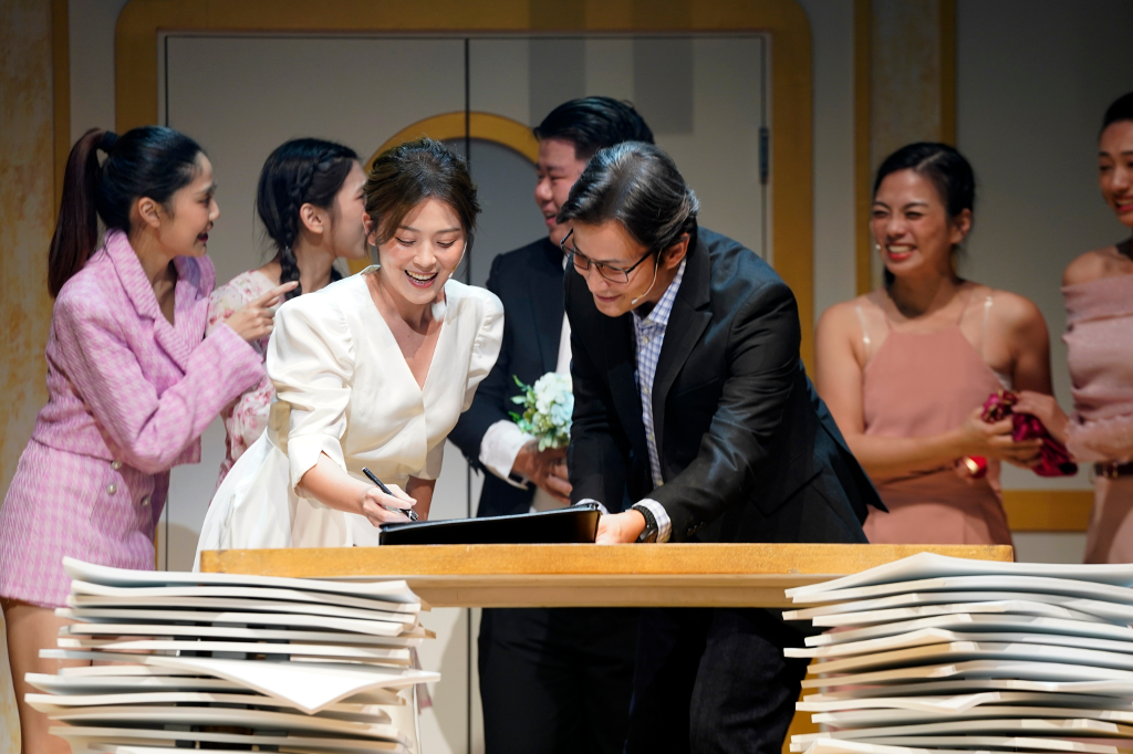 ▲ 演員卓文萱與孫協志重現導演魏德聖與妻子結婚的幸福瞬間。(圖:全民大劇團)