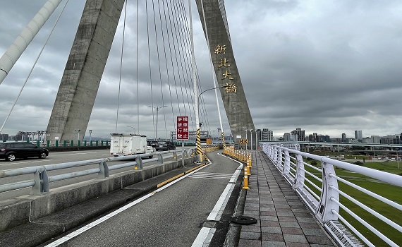 新北大橋在民國99年由前內政部營建署興建,是連接三重區二重疏洪道兩岸的新北環河快速道路交通要道,也是亞洲最長的對稱型單橋斜張橋,雙向各有4車道、路肩、機車道及人行步道。但機車道受橋塔塔柱位置影響呈現S型彎道路型,導致機車族車禍頻傳。經養工處會同交通局和交通警察大隊等單位多次至現場會勘討論後,決定採縮減橋塔段1快車道改為機車道的方式改善,完工後機車道避開轉折彎道路段,將更為安全舒適。