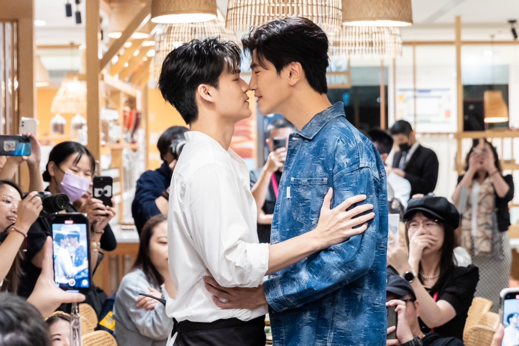 Jame為了見面會提早從泰國來台,昨(30日)下午與劉泯廷現身台北車站泰式餐廳頌丹樂,「瑞卡CP」公開合體擔任一日店長,與40位死忠粉絲共進午餐,兩人手比各種愛心、背後環抱,嘴對嘴共吃一根蝦捲,甚至大方轉圈「360度磨鼻子」給粉絲拍個夠,更開放與每一個粉絲單獨拍合照,任何pose勾手、搭肩有求必應,給足粉絲滿滿的福利,他們很開心與粉絲一起吃飯,這幾天他們正在密集為週六的見面會準備,「有更大的驚喜等著大家!」