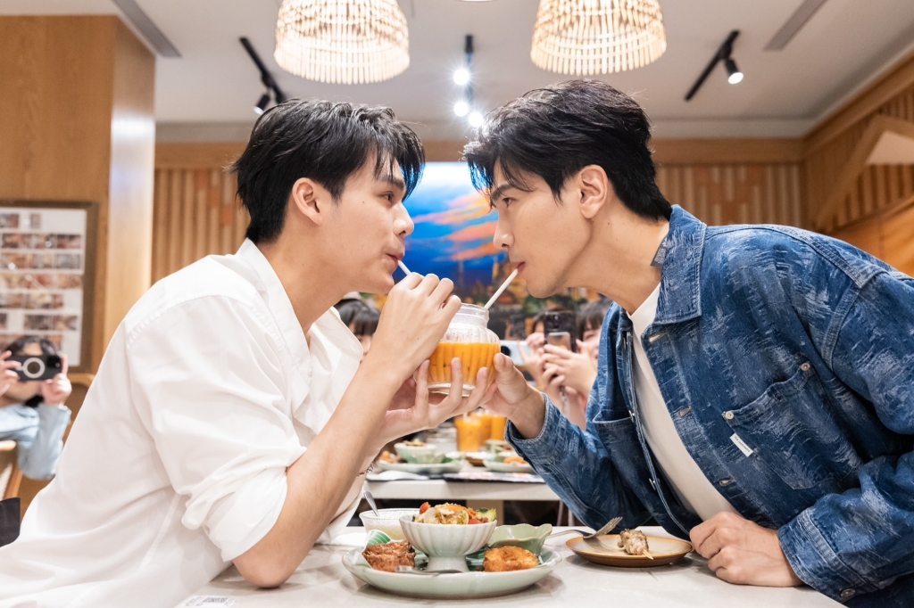 入座之後,「瑞卡CP」劉泯廷、Jame兩根吸管共喝一杯泰式奶茶,彼此眼神笑著對視,劉泯廷不時用叉子餵食Jame,全場粉絲直呼:「好甜!」現場吃的餐點是《彈一場完美戀愛》與知名泰式餐廳頌丹樂聯名合作的「瑞卡CP頌一餐」,劉泯廷一一介紹現場的菜色,包括象徵好運招財的金錢蝦餅、燒烤的椰奶豬肉串,帶有香茅氣味的伊善炸春捲、Q彈炸雞肉,鮮嫩多汁雞上腿以及泰式涼拌海鮮。