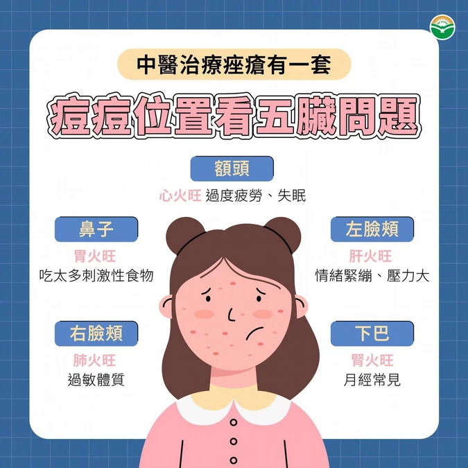 - 雙側臉頰痤瘡:分別代表肝與肺,左臉為肝,情緒緊繃、壓力大的人容易產生肝火;右臉為肺,常見於過敏體質的人。