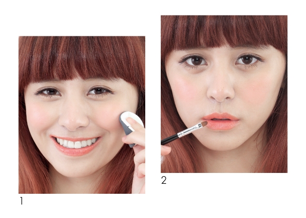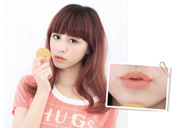 用唇刷沾取質地較水潤的橘色唇膏,或直接以帶有光澤感的橘色唇蜜,均勻塗抹雙唇即可。