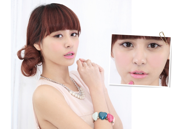 採用較飽和的玫瑰花瓣色彩描繪在眼部,再使用荔枝般的咖啡褐色勾勒出眼尾線條,搭配上粉嫩頰彩,讓你時而¬顯露少女的嬌羞,時而散發小女人的嫵媚!