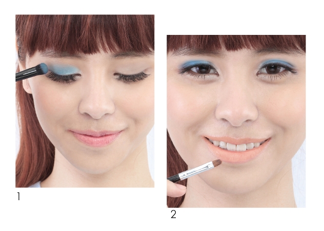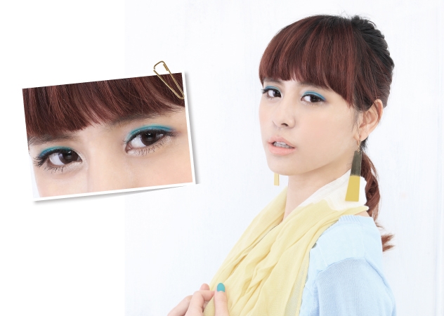 先以粉嫩的藍綠色眼影塗抹在上眼皮至眼窩打底,眼窩可疊少許大地色避免浮腫感,再於眼頭疊上白色打亮,最後在眼尾加一點深藍色製造深邃感,切記少量多次上色。