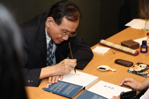 ▲ 分享會現場為讀者揮毫簽名的林水福教授。(圖:聯經出版)