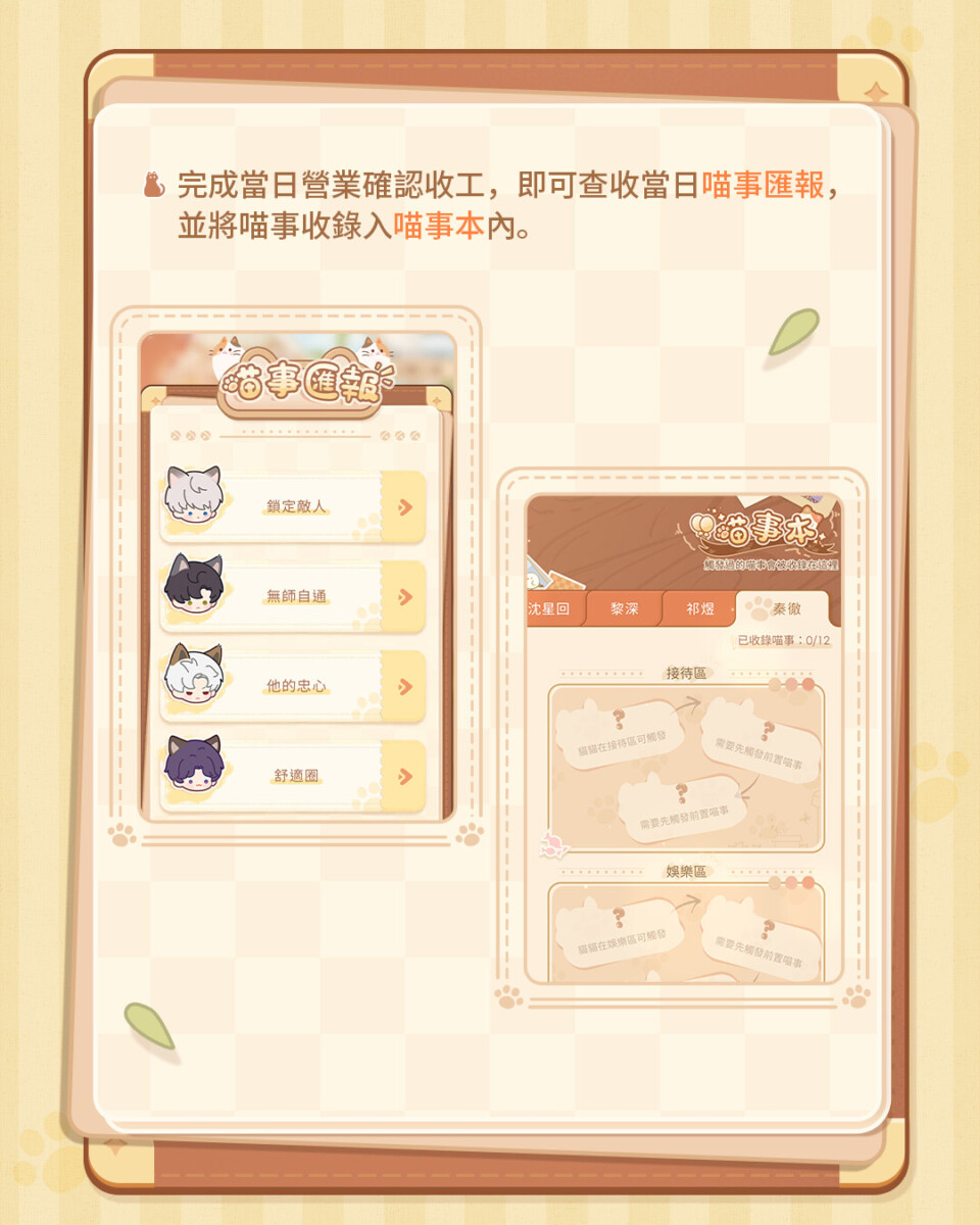 值得一提的是,在貓貓努力營業的過程中,會發生許多獨特喵事。完成當日營業確認收工後,即可查收當日喵事匯報,並將喵事收錄進喵事本內。