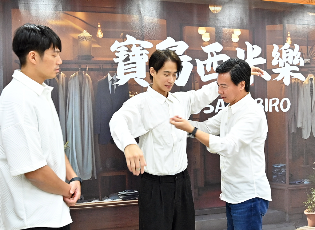 ▲ 尹昭德(右)幫盧彥澤(中)量身,王盈凱(左)在一旁仔細觀察。(圖:台視)