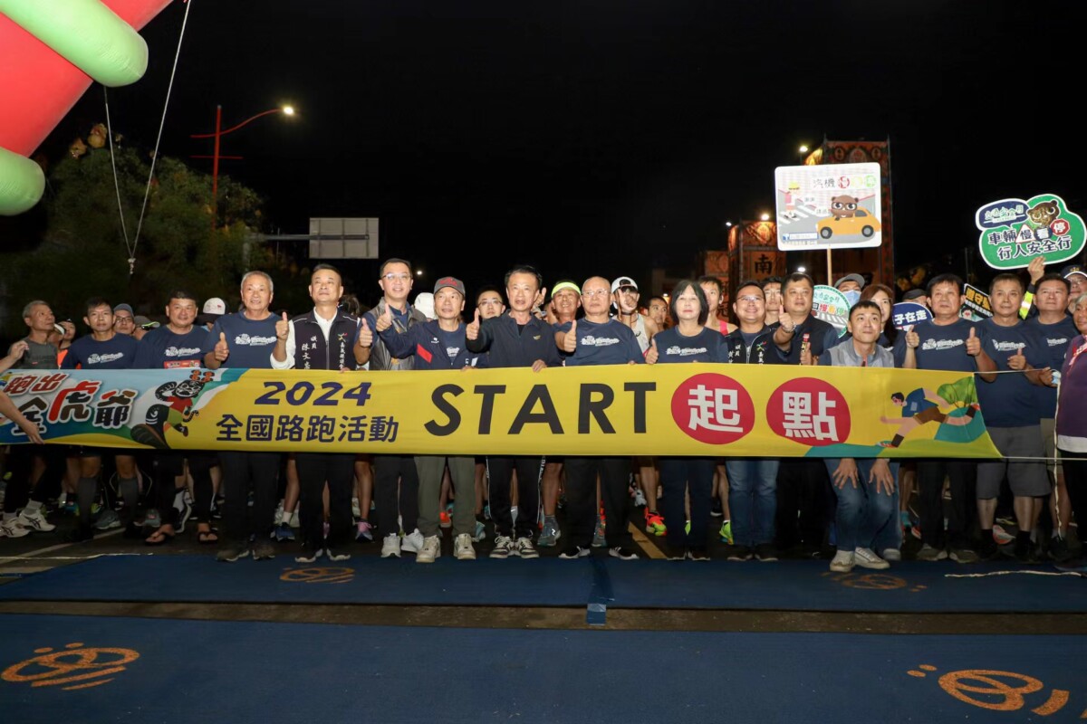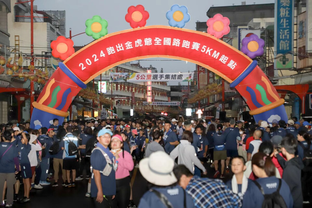 圖:嘉義縣新港奉天宮今(17)日清晨舉行「2024跑出金虎爺」全國路跑賽,藉由賽事介紹奉天宮內供俸的虎爺,比賽分為12.5公里組與5公里組,6000名民眾在縣長翁章梁、鄉長葉日朗和奉天宮董事長何達煌等鳴笛後起跑,場面盛大熱烈。(記者吳瑞興攝)