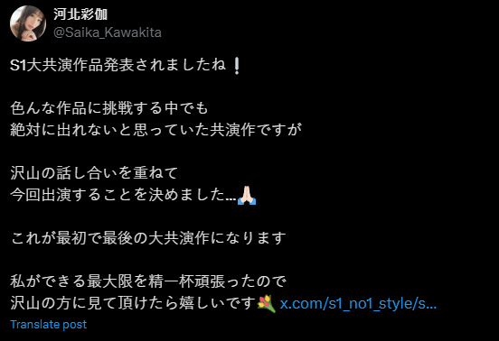 日本AV女星河北彩伽近日在社群平台透露,將出演片商S1的20周年紀念作品,這也是她首次參與多位女優共演的作品。她坦言,「這是我的第一次,也是我最後一次的共演!」