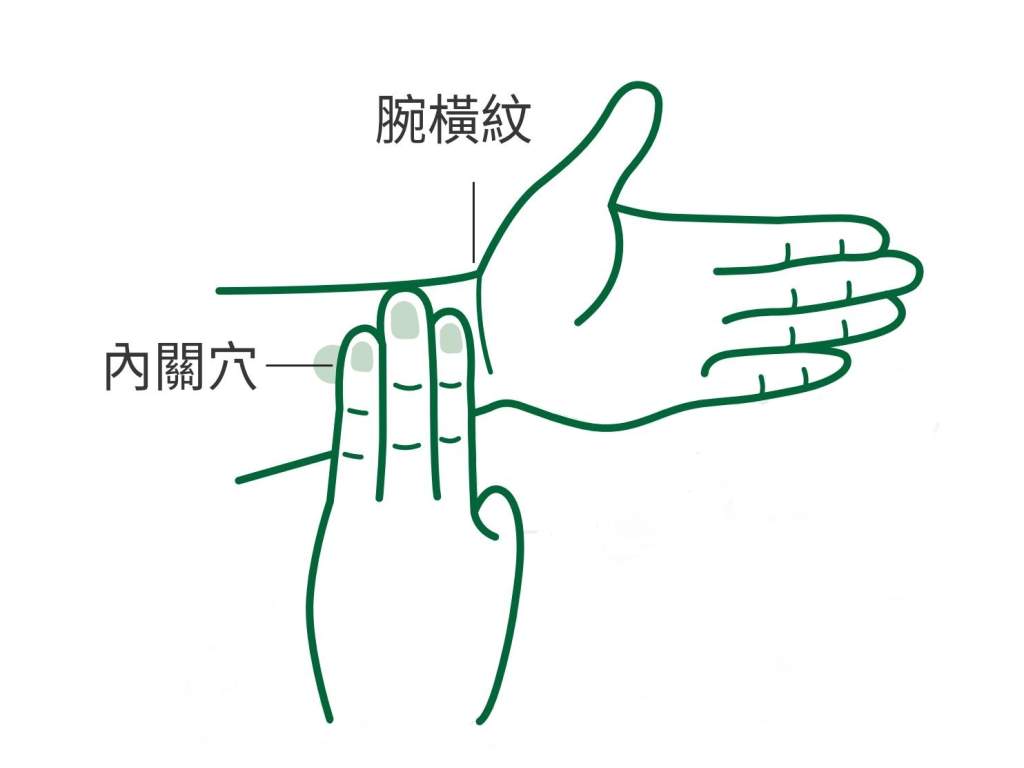 洛桑加參醫師解釋,內關穴位於手腕橫紋上三橫指的位置,在兩條索狀筋之間。如果這兩條筋不夠明顯,可以握拳用力,就能清楚地看到掌長肌肌腱與橈側屈腕肌肌腱的線條,從而準確地定位到內關穴的位置。