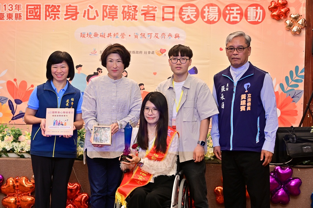 【記者 朱達志/台東 報導】為響應聯合國12月3日「國際身心障礙者日」,臺東縣政府昨(23)日舉辦表揚活動,提前舉辦模範身心障礙者表揚典禮,由縣長饒慶鈴頒獎表揚10位模範身心障礙者,以及績優身心障礙服務單位,並邀請獲獎者與家屬共同參與。饒慶鈴表示,縣府致力打造友善無障礙城市,透過多元支持與服務措施,讓每位縣民都能在臺東安心生活、實現自我價值,並期盼藉由活動凝聚社會力量與愛心,共同創造幸福且包容的社會環境,呼籲縣民一起關懷周遭身障朋友。