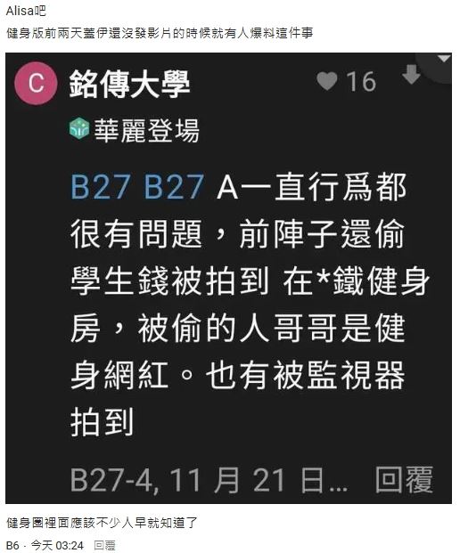 雖然蓋伊在影片中把該名健身教練全用馬賽克遮住,但仍有眼尖的網友比照後,身形與穿著疑似PEETA葛格的前妻Alisa,而網友也發現,在這部影片上傳之前,Dcard就有出現一則留言「A一直行為都很有問題,前陣子還偷學生錢被拍到,在*鐵健身房,被偷的人哥哥是健身網紅。也有被監視器拍到」,由於這句留言大致正確,只有「哥哥」這個詞是錯誤的,遭猜測健身圈早已知道這件事。