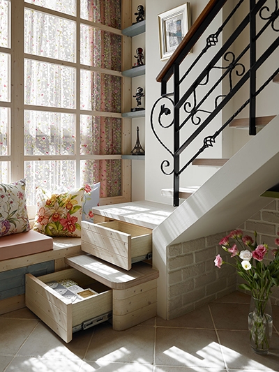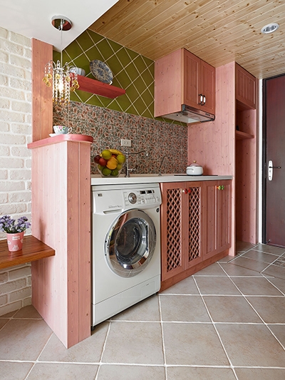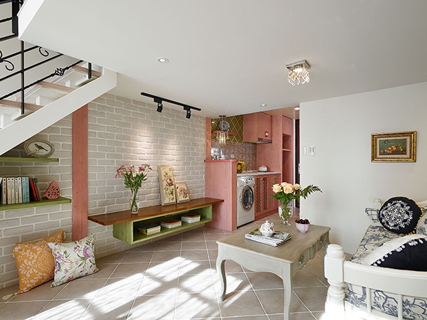 廚房使用了一整面的西班牙花磚,讓空間更有表情更為亮麗,由於是釉面緣故,所以在清潔上也便利許多。設計師巧妙將抽油煙機隱藏崁入收納櫃裡,並把烘衣機置放於流理檯面下方,充分利用剩餘空間,而彩繪把手也是視覺亮點之一。通往二樓的樓梯前二階亦設置了活動式的收納空間,方便屋主收藏物品,而一側的展示櫃則可擺放男屋主喜歡的公仔。