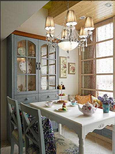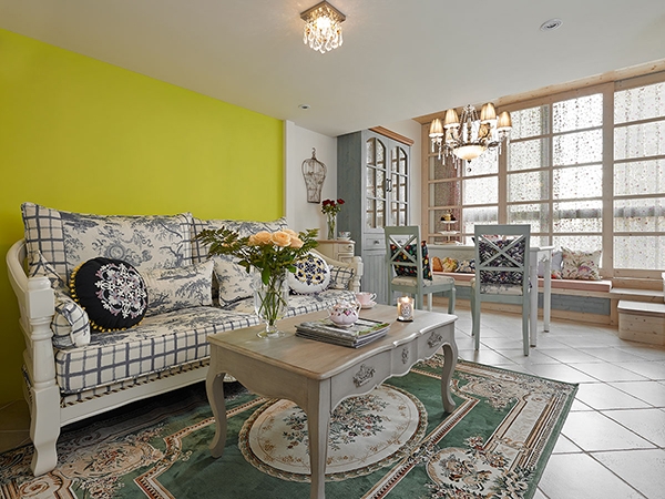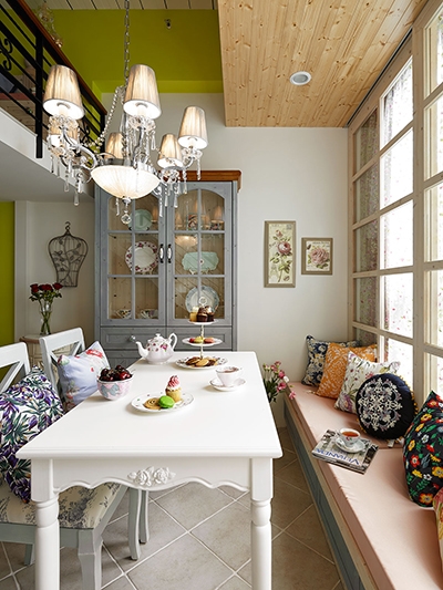 以白色為基調的客廳,搭配各式訂製家具,地板選用西班牙磁磚,呈現出沉穩內斂的鄉村風氛圍,置身其中,也彷彿能感受到一種放鬆的情調,優雅生活的舒適度。原來墊高的和室,為增加空間的機能性,設計師將其重新規劃成餐廳,由於女主人常有朋友來訪,為容納多人的Party,所以客、餐廳為開放式設計,並在臨窗設置一字型的坐榻,如此一來,能夠負荷較多的來客數,營造賓主皆歡的玩樂環境,而天花懸掛特別從國外訂製造型典雅的水晶燈,和鄉村風相輔相成。