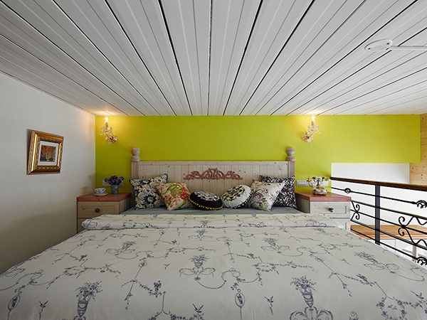 二樓夾層空間規劃為卧室,背牆以綠色調呈現,是鄉村風中常使用的配色,能讓人放鬆心情,又能成為空間的吸晴亮點!衣櫃除了能放置衣物,還能收納物品,並以拉門的形式又美觀又能阻隔灰塵,前方的木質卧蹋,可當成睡前的閱讀或聊天小憩的好地方。衛浴空間較小,但希望比較有變化的呈現,以黃、藍磁磚豐富空間的色彩,地板使用義大利磁磚,像水彩一樣的質感,每塊都有不同層次。