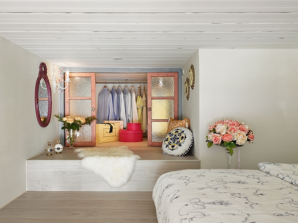 屋主為一對男女朋友,從事金融業,尤其他們偏愛美式鄉村風,所以希望能將改造成心中嚮往的夢想之家。原有的房屋只有8坪,使用面積15坪,是夾層空間,設計師保留採光的優勢,因為狹小空間如果沒有充足採光,會變得陰暗狹小。也因為空間的受限,所以動線規劃並不好施作,為了解決動線問題,所有家具都是量身訂製,如電視櫃、化妝櫃等。