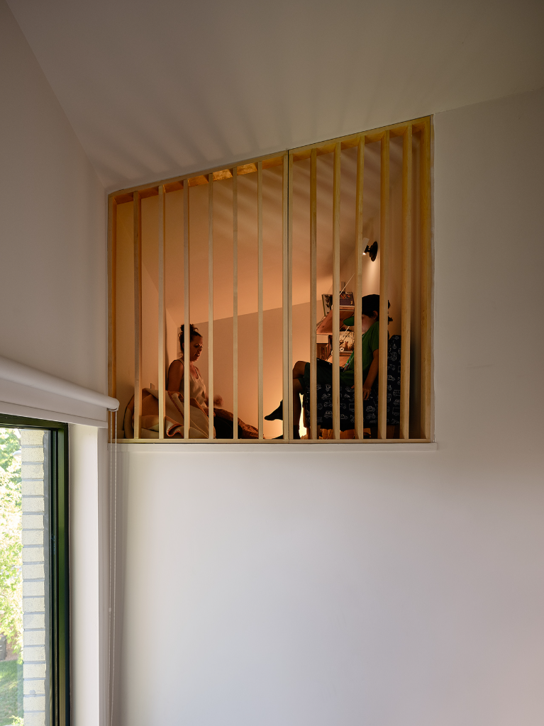 中庭的木質牆壁則不只是表面的裝飾,更擔任著調節光線的重要角色。當陽光透過精心設計的開口映射入內時,木質表面反射出溫暖的金黃色光暈,為整個空間形塑溫馨平靜的氛圍,這樣的光影變化讓空間隨著時間推移呈現不同面貌,為日常人生增添浪漫詩意。