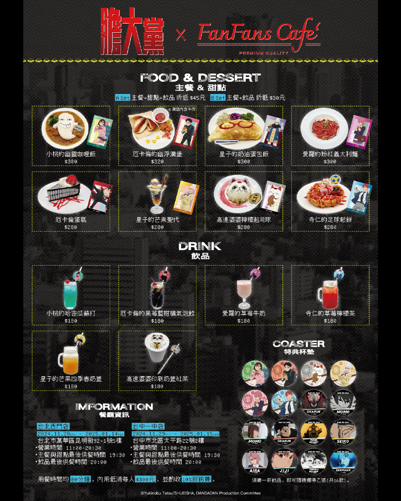 人氣動畫《膽大黨》將首次與FANFANS CAFÉ攜手推出快閃主題咖啡廳,於2024年11月28日起在台北西門店和台中一中店限時登場。餐廳不僅將動畫角色融入多款創意餐點,還帶來台灣限定、由日本特別繪製的全新立繪與周邊商品,粉絲們絕對不容錯過!