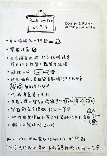 菜單後面還有寫些店內小公告,有空可以看一下,不過其中有一個項目[使用插座之費用皆全數捐給世界和平會樂捐幫助受飢兒]這一點讓我有點好奇,這裡提供的插座不是免費的嗎?據了解後才知道,原來使用插座是採自願式的捐錢方式,客人所捐獻的錢都將捐給世界和平會做愛心,真的好有心,但~你也可以選擇不捐啦,老闆也沒強迫就是嚕!