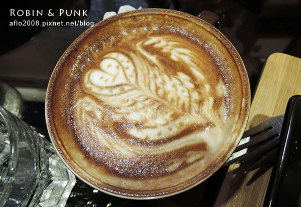 就是這拉花,就是讓我們決定一定要來朝聖的原因!之前工作時也曾學了一下拉花,有學過才知道原來拉花相當的需要經驗及技術,不是說拉就拉的出來的,所以對於能把拉花拉的得心應手的人就很崇拜,最近在樹林板橋一帶吃吃喝喝,[Book Coffee 朝午食]終於讓我找到專業拉花的咖啡廳,真的太HIGH心!