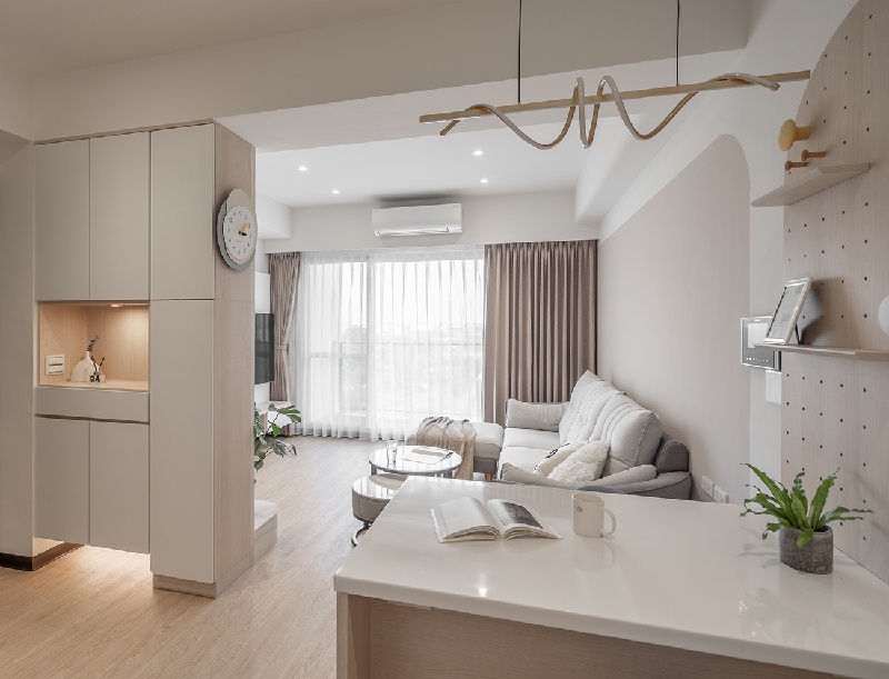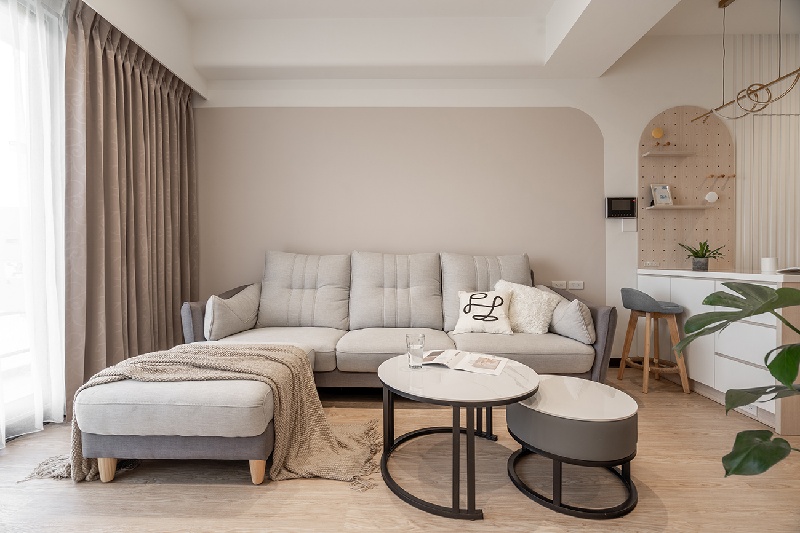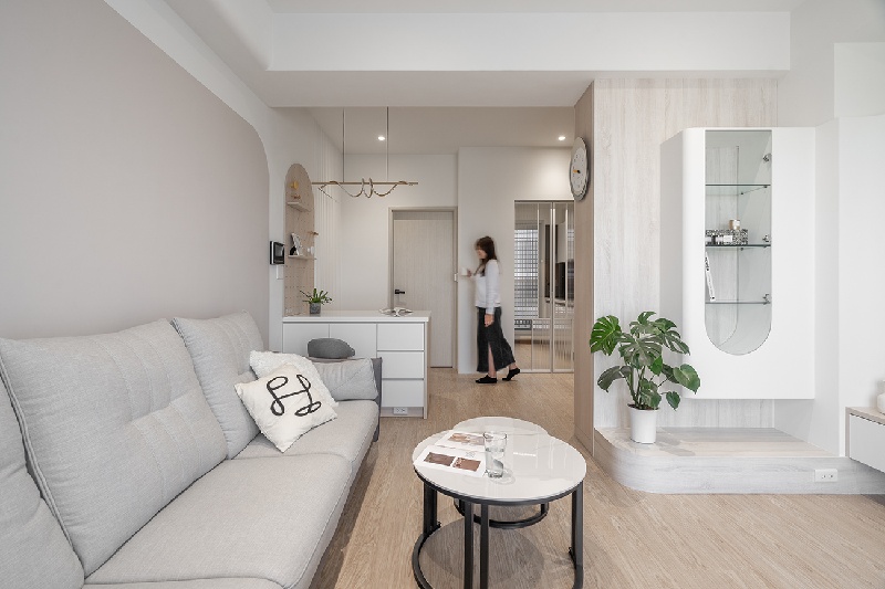 通往至客廳,設計師導入了弧形元素於沙發背牆、樑體、架高平台和電視牆。首先,沙發背牆選用低彩度的灰褐色漆料勾勒出半圓弧造型,以增添淡雅文青氣息。接著,上方樑體以1/4的圓做修飾,既能消弭空間的冷硬感,又能避免沙發區的坐者感到壓迫。再者,於電視牆一側採內弧收邊設計,可有效淡化柱體的銳利稜角。其中,牆面導入拍拍門設計,能將電箱藏匿於牆後,維持空間畫面的簡潔俐落。另外,從玄關櫃延伸至此的弧形平台,呼應主題「圓」的同時,亦可隨喜好擺放植栽或藝術品,展現其獨有的居飾品味。