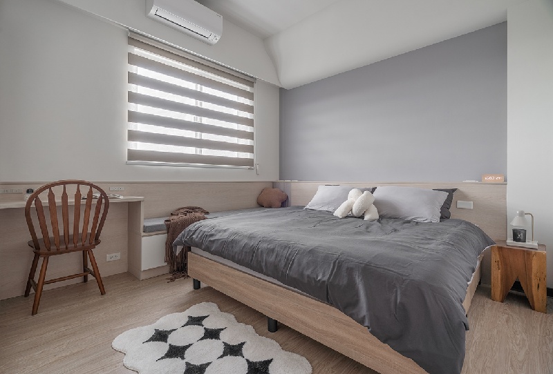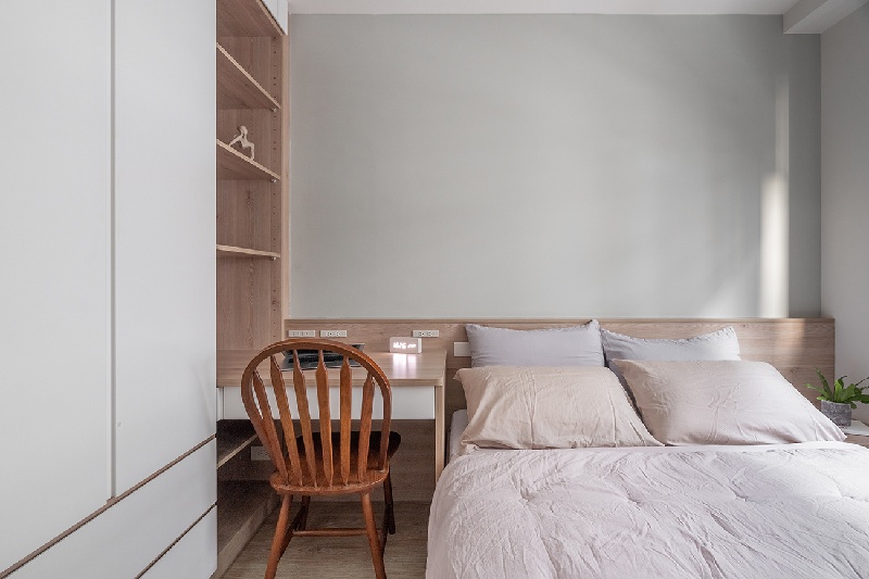 緩步移動至私領域,臥房除了均配有歐德平板床之外,色彩計畫更是以暖調為主,可提供安穩、舒適的睡眠體驗。主臥空間是以低調內斂的灰紫色作為基底。窗邊設有臥榻區,結合了抽屜式櫃體設計,既能讓屋主在此放鬆小憩、閱讀,又能兼具收納功能。書桌側旁的圓弧拱形展示櫃,在貫徹設計主題之餘,還能讓屋主將喜愛的書籍、收藏品陳設於此。長輩房則是以木質調和嫩芽灰色調底定空間調性,以此創造簡約、自然、愜意的休憩氛圍。