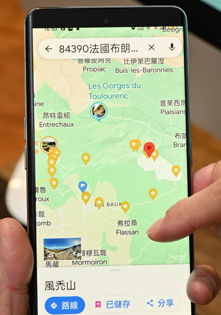 當我們出國在外,開啟手機上谷歌的同步帳號地圖與GPS定位功能後,除了能看見藍色的閃爍GPS目前定位點外,還可以同步讀取到之前所標記的地圖資訊。將這些黃色星號標記,比對目前藍色的衛星定位點,就可確定自己是否在規劃的騎乘路線上移動,因此不需借助導航軟體,也不會走錯路了。