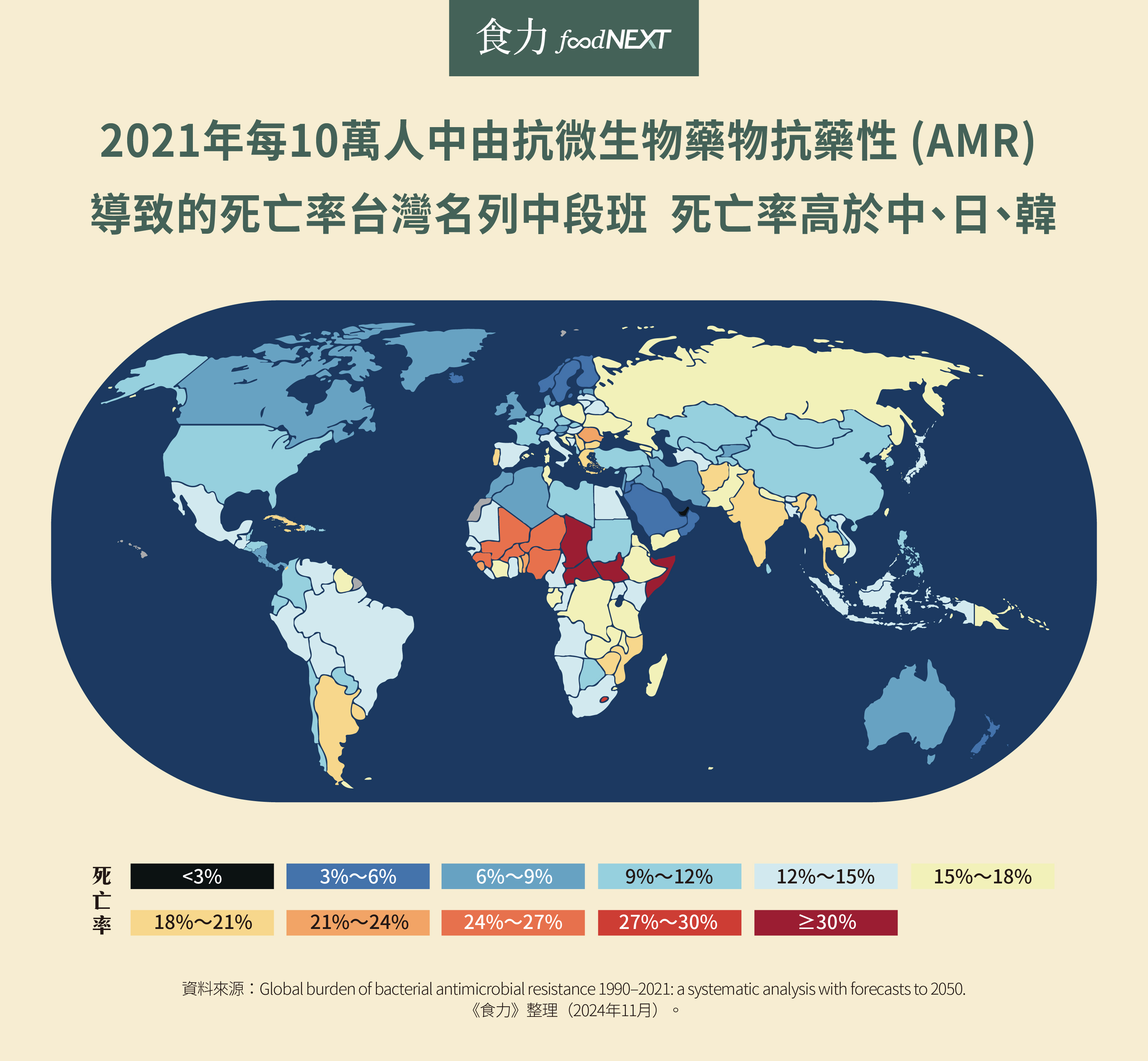 而多虧有更好的醫療措施控制嬰兒感染,這段期間內死於抗藥性細菌感染的5歲以下兒童人數銳減逾50%,除了大洋洲外,其他地區的抗藥性相關死亡人數下降了9%~95%。相反地,在1990年至2021年間,5歲及以上人群的抗藥性死亡率在西歐和中歐以外的所有地區均上升,死於超級細菌的70歲以上人口暴增了逾80%,因為高齡人口已變得更容易受到感染。對於即將邁入超高齡化社會、每5人就有1人為65歲以上人口的台灣而言,這對於國民健康安全無疑是一大威脅。